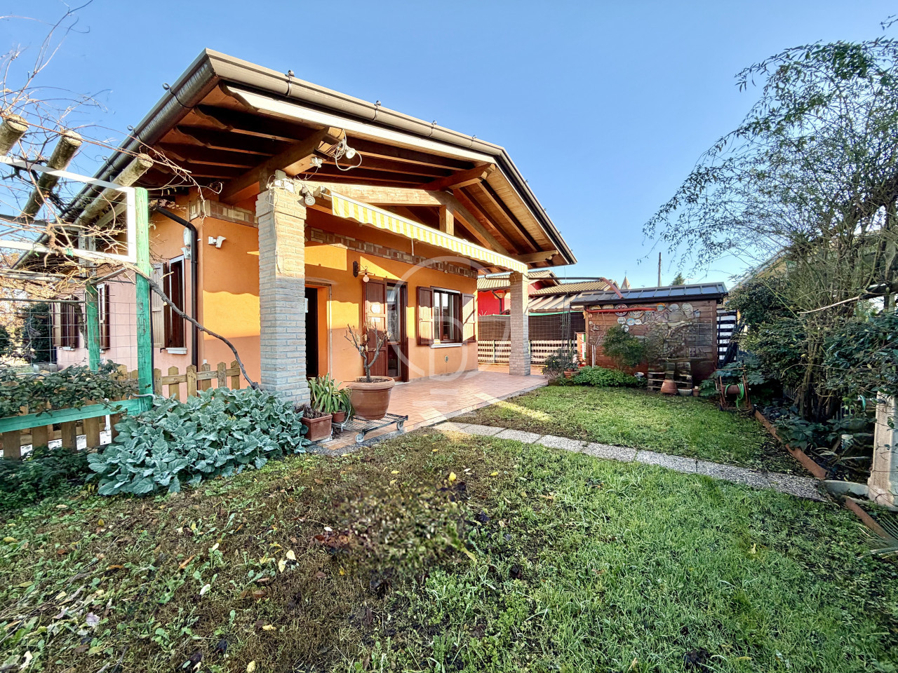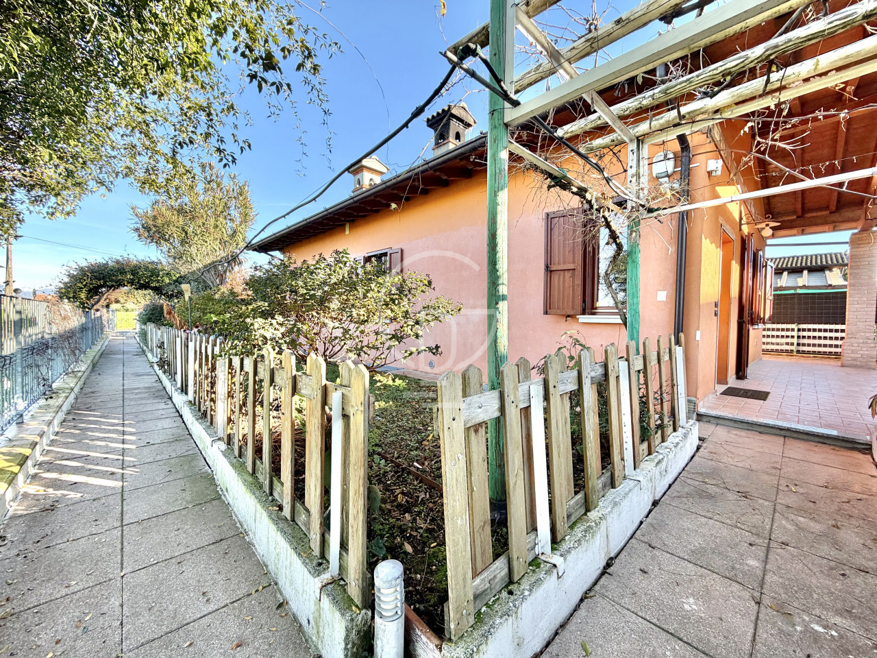 L’abitazione è circondata da un giardino privato di circa 300 mq, perfetto per trascorrere piacevoli momenti all’aperto, ideale per famiglie e per gli amanti degli spazi esterni. L’ingresso avviene tramite un vialetto privato che conduce a un ampio portico coperto, ideale per pranzi e cene all’esterno o per allestire una raffinata area relax.